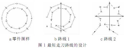 加工圖 1 中 a 圖所示為零件上的孔系。b 圖的走刀路線為先加工完外圈孔后, 再加工內(nèi)圈孔。 若改用 c 圖的走刀路線, 減少空刀時(shí)間, 則可節(jié)省定位時(shí)間近 1 倍, 從而提高了加工效率。