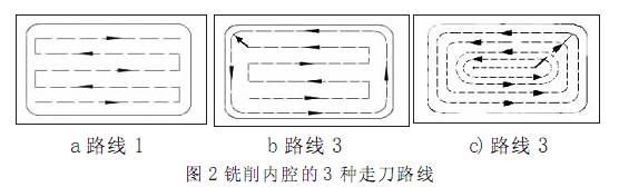 為保證工件輪廓表面加工后的粗糙度要求輪廓應(yīng)安排在最后一次走刀中連續(xù)加工出來。 見圖 2 中 a 圖所示為用行切方式加工內(nèi)腔的走刀路線, 這種走刀方法能切除內(nèi)腔中的全部余量, 不留死角, 不傷輪廓。但行切法將在兩次走刀的起點(diǎn)和終點(diǎn)間留下殘留高度而達(dá)不到表面要求的粗糙度。所以如采用圖 2 中 b 圖的走刀路線, 先用行切法, 最后沿周向環(huán)切一刀, 光整輪廓表面,能獲得較好的效果。圖 c 也是一種較好的走刀路線方式。