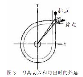 考慮刀具的進(jìn)、 退刀 ( 切入、 切出) 路線時(shí), 刀具的切出或切入點(diǎn)應(yīng)在沿零件輪廓的切線上, 以保證工件輪廓光滑; 應(yīng)避免在工件輪廓面上垂直上、 下刀而劃傷工件表面; 盡量減少在輪廓加工切削過程中的暫停 ( 切削力突然變化會(huì)造成彈性變形) , 以免留下刀痕見圖 3。