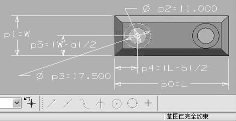 通過建立草圖的全約束和部件家族, 實現(xiàn)自潤導(dǎo)板 2 孔到 4孔個數(shù)和大小的轉(zhuǎn)變(圖 3)。如圖 2 所示為 2 孔自潤導(dǎo)板的全約束效果。