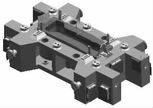 按照圖 1 的流程由產(chǎn)品數(shù)模源文件(圖 4)及技術(shù)要求明細表進行參數(shù)化設(shè)計。分別得到產(chǎn)品的上模、 下模以及壓邊圈(圖 5)。再將它們與標(biāo)準(zhǔn)件裝配起來, 得到最終設(shè)計效果(圖 6)。
