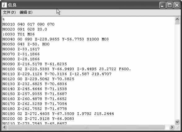 隨后系統(tǒng)進行后處理, 生成程序指定路徑文件名的程序文件, 其中型芯粗加工的 G指令如圖 10 所示。 可將其另存為機床易識別的文件類型, 詳細的 G指令由于篇幅所限不予列出。