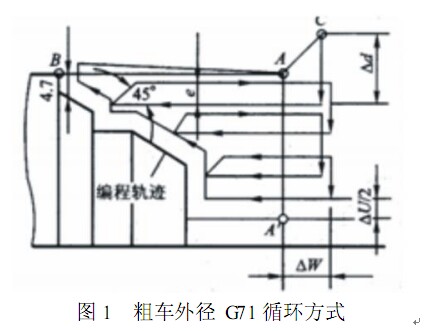 外徑粗車(chē)固定循環(huán) G71 主要用于內(nèi)、 外階梯軸的粗車(chē),毛坯一般為棒料。如圖 1 所示為粗車(chē)外徑的加工路徑。圖中 C是粗加工外徑的起點(diǎn) ,A 是毛坯外徑與端面輪廓的交點(diǎn)。只要在程序中 ,給出 A→A/ → B 之間的精加工形狀及徑向精車(chē)余量ΔU/