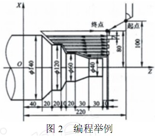 加工如圖 2 所示零件 ,其毛坯為棒料。工藝設(shè)計(jì)規(guī)定:粗加工時(shí)切深為 7 e ,進(jìn)給速度為 0. 3 e /r ,主軸轉(zhuǎn)速 500r/ min ,精加工余量 X向?yàn)?/span> 4mm ,Z向?yàn)?/span> 2mm ,進(jìn)給速度為 0. 15 e / r ,主軸轉(zhuǎn)速 800r/min。程序設(shè)計(jì)如下:
