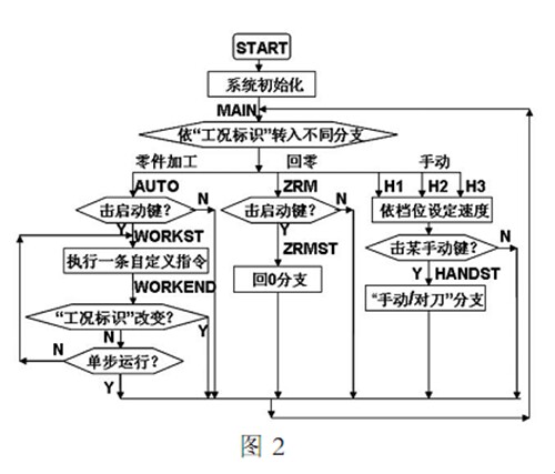 圖 3 為主控軟件框圖 圖 3 考慮了多指令共段和共段指令執行順序 TST 分支實現除 T00 指令外全部 T 指令的功能 M1S 分支實現 了 M03 M04 M06 M97 M98 M99 M21 M22 M23 M24 M25M26 M27 M28 等指令的功能 M2S 分支實現了 M00,M02,M05,M30,M20 等指令的功能 也考慮了模態指令的處理