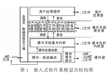 根據(jù)嵌入式軟件的特點(diǎn) 如圖 1 所示 將嵌入式軟件系統(tǒng)自下而上共分為四層 硬件層 基本實(shí)時(shí)內(nèi)核層 操作系統(tǒng)服務(wù)層和用戶應(yīng)用層 各層之間通過各層的頭文件進(jìn)行聲明和調(diào)用