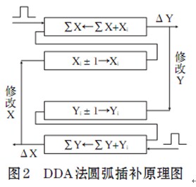 動點坐標(biāo)X是Y坐標(biāo)對t的積分, 而Y是X坐標(biāo)對t的積分。因此, 由ΔX的疊加產(chǎn)生的溢出去進給Y; 由ΔY的疊加產(chǎn)生的溢出去進給X。圓弧積分器的原理圖如圖2所示[1]。