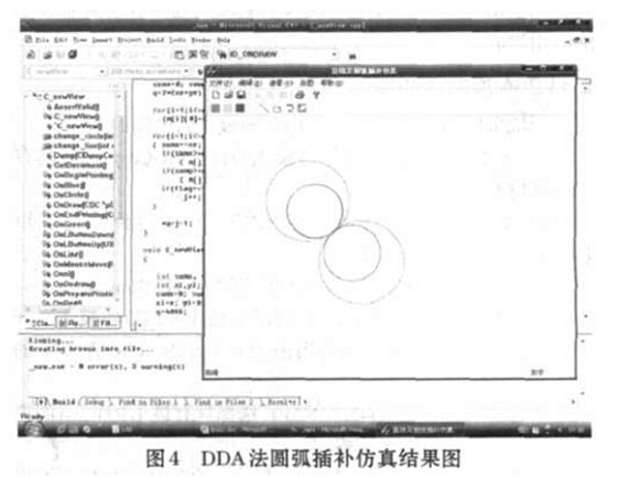 系統(tǒng)采用Visual C++6.0可視化開發(fā)工具編程, 實現(xiàn)了直線和圓弧插補算法。圓弧插補算法編譯運行后的仿真結(jié)果如圖4所示。