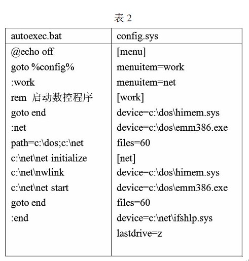 客戶端計算機如果是帶有 Windows 操作系統(tǒng)的計算機,那么網(wǎng)卡的安裝與網(wǎng)絡參數(shù)設置同上,不用設置共享文件夾工作組名稱一定要相同,IP 地址應該在同一網(wǎng)段,這樣客戶端用戶就可以通過訪問服務器端計算機上的共享文件夾直接獲取所需數(shù)控文件 如果客戶端計算機是 DOS 操作系統(tǒng),那么就需要安裝 MS Client 軟件來配置計算機 MS Client 軟件的安裝盤有兩張軟盤,一般只用到第一張 將所用網(wǎng)卡的 NDIS網(wǎng)卡驅動程序 *.DOS 復制到此軟盤內,MS Client 軟件安裝網(wǎng)卡時要用到 運行安裝程序,按照安裝程序的提示依次輸入所需信息 注意工作組和用戶的名字一定要與服務器端設置的名字一致,通信協(xié)議 (protocol ) NetBEUI 必選,如果是 ISA總線的網(wǎng)卡,還需要設置中斷號和 I/O 地址 安裝完成后系統(tǒng)會在根目錄下生成新的 AUTOEXEC.BAT 和 CONFIG.SYS 文件,為了工控機正常運行需要將其配置為多任務啟動方式在需要傳輸文件時系統(tǒng)進入聯(lián)網(wǎng)模式,不需要是關閉網(wǎng)絡連接,釋放系統(tǒng)資源提高系統(tǒng)運行速度 假設 MS Client 軟件安裝在 c:\net 文件夾內,那么文件內容如表2所示