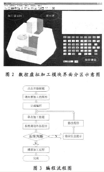 數(shù)控虛擬加工模塊界面分為三個區(qū)域,分別為數(shù)控加工顯示區(qū),編程操作鍵盤和程序顯示屏,如圖2所示。單擊編程開始按鈕“M”,程序顯示屏顯示程序名,即可以進(jìn)行數(shù)控編程,其工作方式按圖3流程圖進(jìn)行。