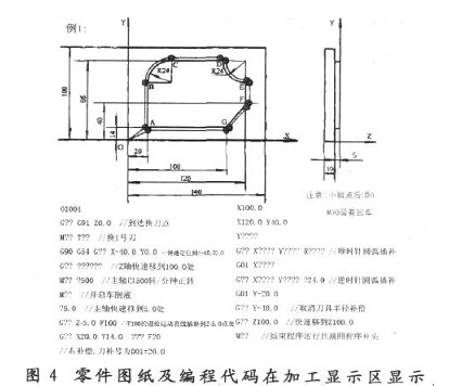 單擊圖形顯示按鈕“后退”,在顯示區(qū)顯示要加工的零件圖紙,然后根據(jù)圖紙和加工路線,結(jié)合現(xiàn)有編程代碼,完成數(shù)控編程。單擊“后退”按鈕,零件圖紙及編程代碼在加工顯示區(qū)顯示出來,如圖4所示。
