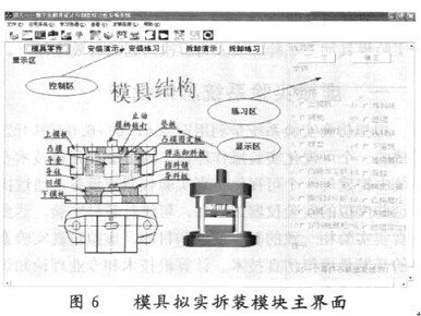 模具擬實拆裝模塊界面分為三個區(qū)域,即控制區(qū)、練習(xí)區(qū)和顯示區(qū),如圖6所示。