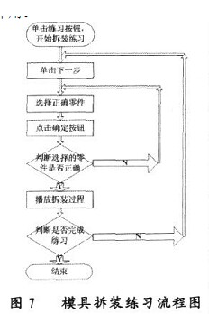 當(dāng)單擊按鈕“安裝演示”,在顯示區(qū)播放模具的安裝步驟和安裝過程。單擊按鈕“拆卸演示”,在顯示區(qū)播放模具的拆卸步驟和拆卸過程。通過觀看演示,懂得實例模具的拆裝步驟,為進(jìn)一步練習(xí)奠定基礎(chǔ)。看完模具安裝演示后,接下來是模具的安裝練習(xí)。通過觀看安裝演示后,知道安裝步驟和安裝的具體過程,這樣學(xué)生就有感性的認(rèn)識。單擊“安裝練習(xí)”按鈕后,激活練習(xí)區(qū)中的各按鈕,開始模具的安裝練習(xí)。單擊“下一步”按鈕,步驟區(qū)顯示模具安裝步驟,提示區(qū)顯示練習(xí)的提示(提示選擇多少個零件),在零件區(qū)里根據(jù)步驟選擇正確的零件,單擊“確定”按鈕,系統(tǒng)自動判斷選擇的零件是否正確,正確的在顯示區(qū)播放安裝過程,錯誤的重新選擇。其練習(xí)流程圖如圖7所示。