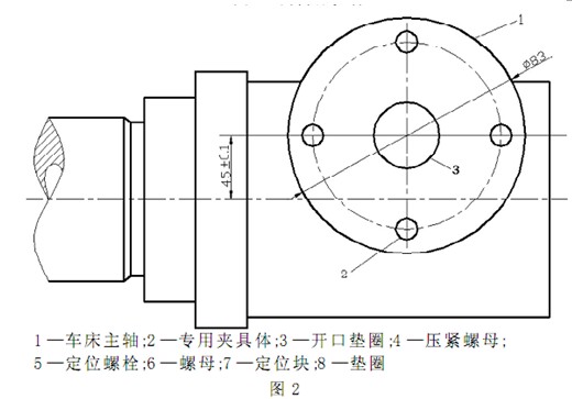 為保證該尺寸, 我們可在角鐵放置工件的基準(zhǔn)平面處( 如圖 1 -2箭頭所示) 鎖緊一高為 3 mm, 直徑為Φ 83 mm 的圓環(huán)鐵片,如圖 1 -3所示。該圓環(huán)鐵片與壓緊螺栓螺母、定位螺栓螺母( 如圖1 -2 的3 、 4 、5 、6 、7 、8所示) 一起緊固工件, 提高工件的定位精度, 并且防止工件在加工過(guò)程中偏移, 以保證加工精度。
