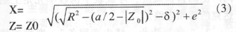 e, Z0。車削后零件在 XOZ平面上的相應曲線為 CB。根據車削原理, 在曲線 CB 上任意點 N是由圓弧 EA上相應點 M繞 Z軸旋轉得到的。如B是由 A繞 Z軸旋轉得到的, C是由 E 繞 Z軸旋轉得到的。故圖 4 中加工出來的曲線 CB 部分的實際軌跡方程為