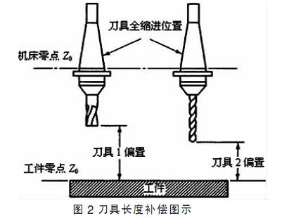 有了刀具長度補償功能 當加工中刀具因磨損 重磨 換新刀而發(fā)生長度變化時 可不必修改程序中的坐標值 只要修改存放在寄存器中刀具長度補償值即可 其次 若加工一個零件需要用幾把刀 各刀的長度不同 編程時不必考慮刀具長短對坐標值的影響 只要吧其中一把刀設(shè)為標準刀 其余各刀相對標準刀設(shè)置長度補償值即可 如圖2