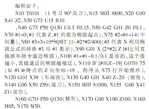 橢圓加工 普通機(jī)床很難完成 而數(shù)控機(jī)床確能夠輕松的加工出來 主要是因?yàn)闄E圓加工的時(shí)候 X Z 兩坐標(biāo)是同時(shí)變化的 數(shù)控機(jī)床是通過程序控制的方式來驅(qū)動(dòng)兩軸 實(shí)現(xiàn)兩軸的共同運(yùn)動(dòng) 但數(shù)控車床只具有直線插補(bǔ)和圓弧插補(bǔ)兩種基本插補(bǔ)功能 不具備橢圓插補(bǔ)功能 所以加工橢圓時(shí)可以采用直線逼近法的方式進(jìn)行加工 即把曲線用許多小段的直線來代替 無限接近橢圓輪廓的加工方法 下面選用 FANUCOiTC 數(shù)控車削系統(tǒng) 結(jié)合工作實(shí)踐談?wù)勅绾吻捎煤瓿绦蚪鉀Q橢圓編程問題