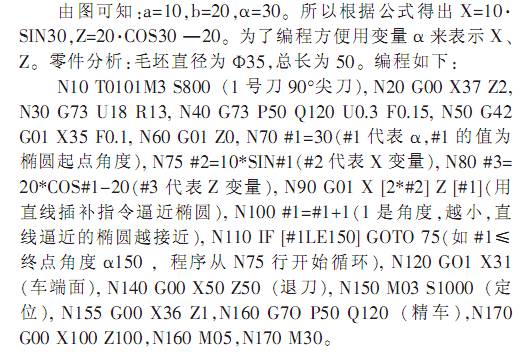 用極坐標(biāo)方式標(biāo)注橢圓 在零件圖紙上比較常見的 一般是以角度 a 標(biāo)注 標(biāo)出起始角度和終點(diǎn)角度 這時(shí)就需要寫出橢圓的極坐標(biāo)方程 兩個(gè)方程是 X=a sin ,Z=b cos 其中變量是 #1=a #2=Z #3=X