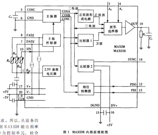 MAX038 芯片的核心部分是一個電流控制的基本振蕩器, 工作電源采用± 5V, 內部提供 2.5V 基準電源, 通過外接電阻 RIN、 RF 向主振控制器的 IIN 端和 FADJ 端提供頻率粗調電流和頻率細調電壓; 通過電阻 RD 向 DADJ端提供脈沖占空比調節電壓。這 3 個參數經主振控制器處理后, 向振蕩器提供充電電流, 該電流對外接電容 CF充電和放電, 形成振蕩, 產生三角波信號 A、 B、 C。信號A 送正弦波形成電路, 產生正弦波; 信號 B、 C 送入比較器 1, 產生方波。正弦波、 方波和三角波被同時送入波形選擇器, 可以通過和 TTL/CMOS 電平兼容的地址輸入(A0、 A1)來選擇其中的一種波形輸出。 另外信號A 送入比較器 2, 產生同步信號 SYNC, 供外圍電路使用; 信號 B、 C 送入相位檢測器, 產生PDO 信號和 PDI 信號, 供鎖相環電路使用。