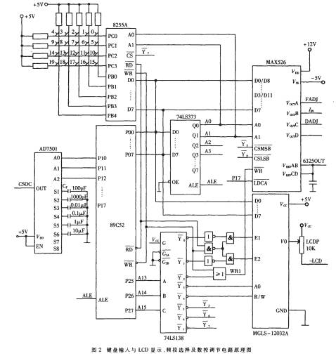 數字化波形發生器主要由主控制器單片機 89C52、鍵盤與顯示電路、波形發生器 MAX038、 12 位 4 路數模轉換器 MAX526、頻段控制單元、幅值控制單元等單元電 路 組 成 。 單 片 機 主 要 完 成 對 鍵 盤 輸 入 的 檢 測 、對MAX038 輸出波形的選擇、 對 D/A 輸出控制, 從而完成對頻率和占空比的調節及對頻段的選擇; 鍵盤采用 4× 5的矩陣鍵盤, 分別設置了數字鍵( 0~9) 和功能鍵( 小數點" ."、 頻段、 頻率、 占空比、 幅值、 正弦波、 方波、 三角波、取消等) 共 19 個鍵。使用時先按功能鍵后按數字鍵; 顯示部分采用 LCD 顯示頻率(6 位)和幅值(4 位); MAX038函數發生器芯片是系統的核心部分, 在單片機的控制下輸出正弦波、 三角波、 矩形波, 且波形的頻率和占空比易于調節; 12 位 4 路輸出的數模轉換器 MAX526 在單片機的控制下, 輸出 2~750μ A 的電流及± 2.4V 和± 2.3V 的電壓, 分別進行頻率、 占空比的調節; 頻段選擇單元采用 8選 1 的多路模擬開關 AD7501, 在單片機的控制下使每一路分時選通, 將不同的電容值 CF 接入 MAX038 電路中, 就可確定輸出頻率范圍, 即頻段, 共有 6 個頻段供選擇切換, 輸出波形頻率范圍與 CF 的關系如表 1 所示。幅度控制單元主要調節輸出信號的幅度, MAX038 輸出端OUT 的 VP - P =2V 幅度值通過放大器放大后送入數字衰減器 AT- 280 中進行衰減, 調整放大后的輸出幅度。鍵盤輸入與顯示、 頻段選擇及數控調節電路原理圖如圖 2所示。