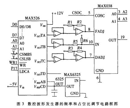 MAX038 的輸出頻率主要受振蕩器電容 CF、 IIN 端電流 IIN 和 FADJ 端電壓 VFADJ 控制。選擇一個 CF 值, 對應IIN 端電流變化, 將產生一定范圍的輸出頻率。另外, 改變 FADJ 端的電壓, 可以在 IIN 控制的基礎上, 對輸出頻率實現微調控制。 可通過電壓輸出型的 DAC MAX526 實現輸出頻率的數控調節。MAX038 的 IIN 端和 FADJ 端分別連接到 MAX526 的 VOUTA 和 VOUTB 兩個輸出端上。通過 V B 產生 0V( 00H) 到2.5V( 0FFH) 的輸出電壓, 再經電壓/電流轉換網絡, 在 IIN 端產生 0μ A 到 750μ A 的工作電流, 使之產生相應的頻率范圍。VOUTB 將此工作電流范圍分為 256 級步進間隔, 輸出頻率范圍也被分為 256級步進間隔。所以, IIN 端電流實現了對輸出頻率的粗調。VOUTA 在 FADJ 端產生一個從- 2.4V( 00H) 到+2.4V( 0FFH) 的電壓范圍, 該范圍同樣也包含 256 級步進間隔, 將 IIN 端的步進間隔再次細分為 256 級步進間隔,從而在粗調的基礎上實現微調。各頻段的頻率范圍劃分為 65 536 級間隔。 MAX526 的 VOUTC 在 DADJ 端產生一個從- 2.3V( 00H) 到+2.3V( 0FFH) 的 電壓 調節范 圍, 對 占空比實現數字控制, 該范圍包含 256 級步進間隔。VOUTC的每一級步進對應著 Δ V=[2.3- ( - 2.3) ]/256=17.9mV 和V%=( 90%- 10%) /256=0.3125。調節占空比時應盡量避免輸出頻率發生變化。僅當 δ =15%~85%且 25μ A<IIN<250μ A 時, 對頻率影響最小。數控波形發生器頻率和占空比調節電路的原理圖如圖 3 所示。