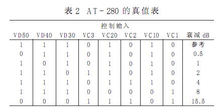 MAX038 的輸出信號本身在輸出級有內部的輸出放大器, 具有很強的驅動能力, 且輸出阻抗小于 0.1Ω, 但是, 由于其輸出波形的幅度為 2VP- P, 若要調節它的輸出幅度, 特別是當輸出頻率較高、 輸出波形不是正弦波時,要進行幅度放大相當困難。所以, 要為 MAX038 的 3 種10Hz~10MHz 輸出波形配置一種通用的全帶寬后級輸出放大器。放大以后的輸出信號送入數字衰減器 AT- 280進行衰減。AT- 280 是一種采用 SOIC- 16 塑封表貼封裝形式的 5 位、 0.5B 步距的數字衰減器, 非常適用于高精度衰減、 快速開關、 極低功耗要求的場合, 其可靠性非常高。VC1、 VC10、 VC2、 VC20、 VC3、 VC30、 VC40、 VC50 分別為 數 據 控 制 端 ; RF1 和 RF2 分 別 為 信 號 輸 入 輸 出 端 。AT- 280 的真值表如表 2 所示。