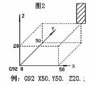 指令中的 X- Y- Z- 是刀具上某一點 (一般是刀具基準點)在新建工件坐標系中的坐標值(圖 2)。由于用 G92(G50)指令建立的坐標系原點是根據(jù)刀具位置確定的, 當程序啟動時刀具處于機床不同位置, 工件坐標系原點的位置也隨之改變。所以用這種方式建立工件坐標系時, 編程人員需要在工序簡圖中標出刀具位置, 程序啟動前一定要把刀具移動到這個指定的位置。為了在加工下一工件時不致發(fā)生坐標原點改變, 程序結束時應當把刀具移回程序開始時的位置。