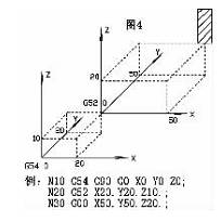 局部坐標系是在工件坐標系 G54- G59 中的設置的子坐標系(圖 4) , 局部坐標系在程序中用指令 G52 設置取消。