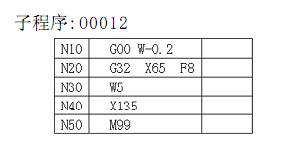 根據(jù)以上分析,用刀寬為端面矩形螺紋車刀,以右刀尖為對刀點,對圖(一)所示零件圖中數(shù)控車削端面矩形螺紋時所編制的程序如下表: