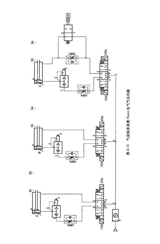 氣動鉆床氣壓回路如圖8-19所示,案例中的氣動鉆床氣壓傳動系統,是利用氣壓傳動來實現進給運動和送料、夾緊等輔助動作。它共有三個氣缸,即由左至右分別是送料缸、夾緊缸、鉆削缸。