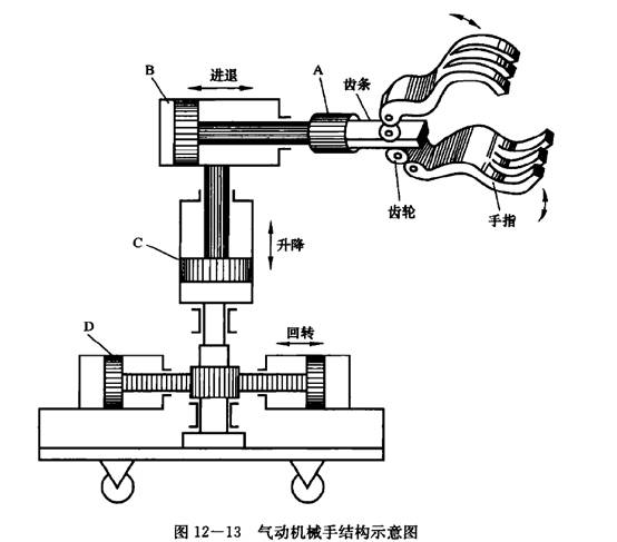 氣動機械手是機械手的一種,它具有結(jié)構(gòu)簡單、重量輕、動作迅速、平穩(wěn)可靠、不污染工作環(huán)境等優(yōu)點。在要求工作環(huán)境潔凈、工作負載較小、自動生產(chǎn)的設(shè)備和生產(chǎn)線上應(yīng)用廣泛,它能按照預(yù)定的控制程序動作。圖12一13為一種簡單的可移動式氣動機械手的結(jié)構(gòu)示意圖。它由A、B、C、D四個氣缸組成,能實現(xiàn)手指夾持、手臂伸縮、立柱升降、回轉(zhuǎn)4個動作。
