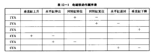三個氣缸均有三位四通雙電控換向閥1, 2, 7和單向節(jié)流閥3, 4, 5, 6組成換向、調(diào)速回路。各氣缸的行程位置均有電氣行程開關(guān)進行控制。表12-1為該機械手在工作循環(huán)中各電磁鐵的動作順序表。