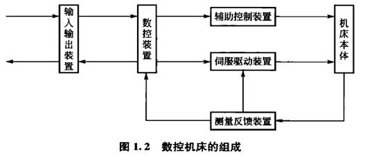 數控機床一般由輸人輸出裝置、數控裝置、輔助控制裝置、伺服驅動裝置、測量反饋裝置和機床本體等部分組成,如圖1. 2所示。