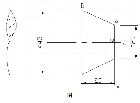 直線插補(G01) : G01X__Z__F__刀具以指令的進給速度移至坐標(biāo)值為X、 Z的點上。 例如, 如圖1 所示G01X45Z-20F30(A—B) :