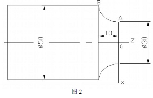 圓弧插補G02 (順時針) 和G03 (逆時針) : G02 (G03) X__Z__R__F__, 刀具以F速度沿半徑R 移至圓弧終點X、 Z 點上。 例如, 如圖 2 所示 G03X50Z-10R10F100 (A—B) :