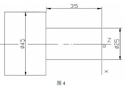 筆者認(rèn)為在講解加工指令的同時應(yīng)講解加工工藝, 以便讀者理解接受所講的加工指令。 在普通車床加工零件, 車床加工的切削用量, 工序工步安排以及走刀路線等內(nèi)容, 往往都是由操作工人決定, 操作工人會按零件圖樣的技術(shù)要求, 按一定的切削深度, 逐層把毛坯的余量切除, 不會因吃刀深度太大而損壞車刀, 從而保證加工零件的質(zhì)量。 而數(shù)控加工的所有工序工步, 切削用量, 走刀路線, 加工余量和所用的尺寸及類型等都要編入程序中, 編程可參照普通車床的逐層加工過程的原理, 使用有關(guān)的加工指令把加工過程逐層編寫出來即可。所以筆者在講授數(shù)控加工指令時, 會結(jié)合普通機加工的切削用量進行一起比較分析。 如上面所列的數(shù)控加工例子, 應(yīng)在講解有關(guān)G01,G02, G03等指令時, 要講吃刀深度問題, 若吃刀深度過大, 可分層應(yīng)用有關(guān)加工指令逐層編程加工, 最后一次走刀才按照零件圖樣的尺寸進行編程。這樣可避免初學(xué)數(shù)控加工的學(xué)員誤解數(shù)控加工工藝與數(shù)控加工指令的關(guān)系而產(chǎn)生困惑。經(jīng)過按每次走刀的吃刀深度, 逐層加工編程之后, 初學(xué)數(shù)控編程的學(xué)員已經(jīng)對加工指令有了初步的認(rèn)識, 然后對車削加工余量較大,一個表面需要進行多次反復(fù)加工的零件, 為簡化編程可使用固定循環(huán)指令 (如G71、 G72、 G73、 G84 等) 編程加工, 若精度要求比較高的零件再配合精車循環(huán)(G70)進行編程加工。例如車削如圖 4 所示的臺階工件, 直徑從 45mm車至 25mm, 臺階長度為 35mm。