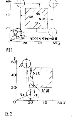 原因是當從N4段進入刀補啟動階段后,只能讀入N6、N8兩段,但由于Z軸是非刀補平面而且讀不到N10以后的段,也就作不出矢量,確定不了進刀的方向。此時盡管用G41進入了刀補狀態,但刀具中心卻并未加上刀補,而直接移動到了點P1,當P1執行完N6、N8段后,再執行N10段,刀具中心從P1移動到交點A,此時就產生了圖2所示的進刀超程(過切)工件被切掉一塊。