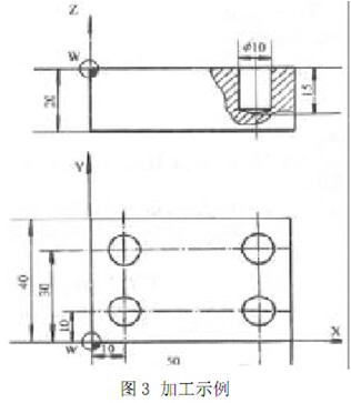 圖3 所示零件,加工孔系,零點(diǎn)在工件左上角, 選用Φ 10mm 的鉆頭, 進(jìn)給速度F=15mm/min,主軸轉(zhuǎn)速S=500r/min。我們分別在兩系統(tǒng)中進(jìn)行編程,程序如下: