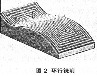 ( 2) 環(huán)行銑削( 圖 2) 。這種切削方式是同時對多張曲面進行加工的計算方法, 其走刀路線是以外輪廓的形狀由外向內(或由內向外)進行走刀, 是最常用的走刀方式之一。