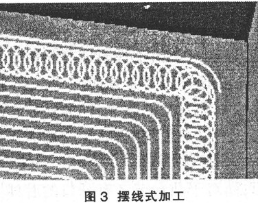 ( 3) 擺線式加工( 圖 3) 。這是一種專門針對高速加工的刀位軌跡策略, 所謂“擺線”即為圓上一固定點隨著圓沿曲線滾動時生成的軌跡, 由于切削過程中總是沿一條具有固定曲率的曲線運動, 使得刀具運動總能保持一致的進給率, 所以對高速銑比較適合。