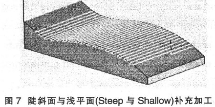 ( 7) 陡斜面與淺平面(Steep 與 Shallow)補充加工( 圖 7) 。加工之前首先分析計算曲面斜度, 將曲面斜度大于某一設定值的曲面定為陡斜面, 反之為淺平面。該方法可以測定并補充加工由平行加工及 Z向等距加工后的殘留高度過大的曲面區(qū)域。在圖 7中, 曲面斜度設為 30°, 所以曲面角度小于 30°的才進行補充加工。