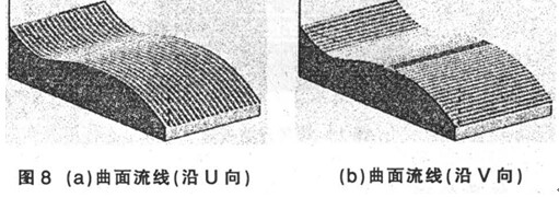 ( 8) 曲面流線( Flow- line) 加工( 圖 8) 。刀具軌跡沿某曲面的曲面坐標系的 U向或 V向的曲面流線方向生成, 可以得到沿曲面伸展的特定的加工軌跡。