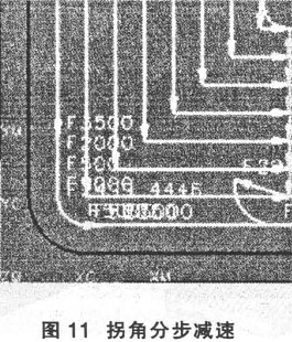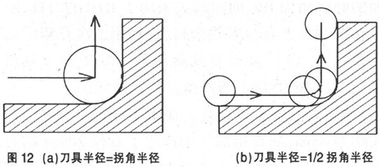 在數控高速切削加工中, 刀具軌跡拐角的處理是十分重要的, 因為即使切削深度很淺, 進給速度和走刀軌跡的劇烈變化也是造成刀具破損的重要原因之一。 為避免這種情況, 應調整進給速度, 從而調整每一個刀刃的切削量( 圖 11) , 在圖中的拐角處, UG NX3.0 采用了分步減速的方法。同時要避免刀具軌跡的劇烈變化( 圖 12) , 圖中的圓角如果用等半徑的刀具直接加工, 如圖 4- 12 ( a) 所示, 則進給方向發(fā)生突變勢必會使機床負荷猛然增加, 所以, 加工這種類型的圓倒角最好是使用較小半徑的刀具, 一般情況下刀具半徑最好為圓倒角幾何尺寸的 70%或更小, 這樣可使拐角處的切削刀具進給方向變化平滑, 避免刀具的突然轉向, 見圖 4- 12b) 。使用小直徑刀具加工和直接切入拐角相比,機床負荷可以降低 3 倍左右。